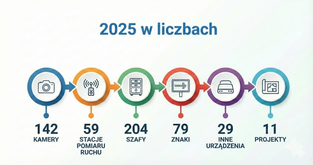 W 2025 roku w zakończonych wdrożeniach roku znalazło się łącznie: 142 kamery, 59 stacji pomiaru ruchu, 204 szafy sterownicze, 79 znaków, 29 innych urządzeń polowych stanowiących 11 kompletnych projektów, które przeszły pełen cykl od koncepcji, przez projekt, produkcję i testy, po uruchomienie i przekazanie do użytkowania.